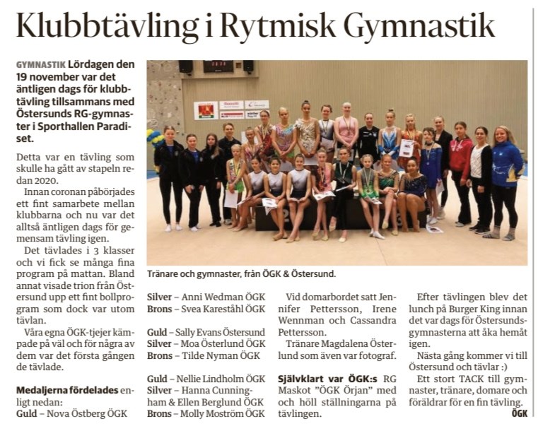 Lördagen den 19/11 var det äntligen dags för klubbtävling tillsammans med Östersunds rg gymnaster. Innan coronan påbörjades ett fint samarbete mellan klubbarna och nu var det alltså dags för gemensam tävling igen. Det tävlades i tre klasser och vi fick se många fina program. Bland annat visade trion från Östersund upp ett fint bollprogram som dock var utom tävlan. Guld Nova Östberg Silver Anni Wedman Brons Svea Kareståhl Guld Nellie Lindholm Silver Hanna Cunningham & Ellen Berglund Brons Molly Moström Guld Sally Evans Silver Moa Österlund Brons Tilde Nyman Dagens domare var Jennifer Pettersson, Irene Wennman och Cassandra Pettersson Tränare Magdalena Österlund - även foto Tack alla för en trevlig tävling och efterföljande lunch sponsrat av Burger King Övik Nästa gång kanske vi ses på tävling i Östersund Örnsköldsviks GK 20 nov 2022 0kommentarer