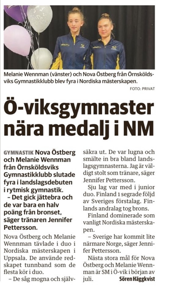Så är det dags för NM - Nordiska mästerskapen i rytmisk gymnastik . Melanie Wennman och Nova Östberg representanter ÖGK / Sverige i duo. Med Jennifer Pettersson som tränare Vi önskar dem Stort Lycka till ! Ha så roligt tjejer Örnsköldsviks GK 6 maj 2022 0kommentarer