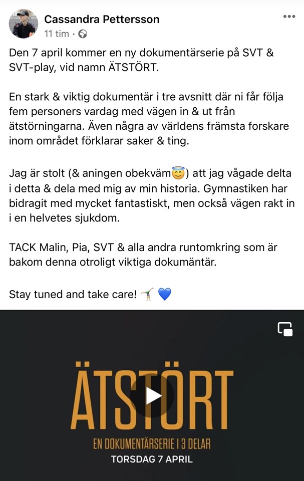 Med start den 7 april visar SVT och SVT Play en dokumentärserie i tre delar som heter "Ätstört" En viktig serie där vår Elitgymnast Cassandra Pettersson deltar Se den ! Örnsköldsviks GK 14 mar 2022 0kommentarer