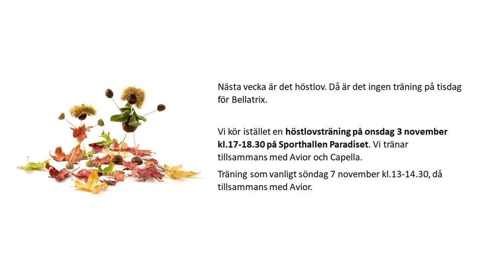 Nästa vecka är det höstlov. Då är det ingen träning på tisdag 2 november för Bellatrix. Vi kör istället en höstlovsträning på onsdag 3 november kl.17-18.30 på Sporthallen Paradiset. Vi tränar tillsammans med Avior och Capella. Träning som vanligt söndag 7 november kl.13-14.30, då tillsammans med Avior. Trupp Ljusblå 26 okt 2021 0kommentarer