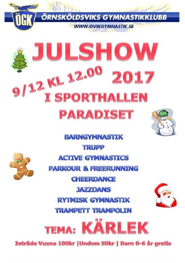Nu är det snart dags för julshow. Truppen kommer att medverka på en punkt. Då temat är kärlek är det röda kläder som gäller, uppsatt hår och gärna lite glitter. Vi träffs i Sporthallen en halvtimme för showen, ombytt och klar. Meddela vid träning, mail eller sms om ni kan vara med eller inte (senast 27 nov). Mvh Anna och Malin Trupp Ljusgul 22 nov 2017 1kommentar